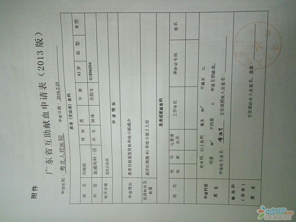 正文摘要:本帖最后由 風(fēng)雨/陽(yáng)光 于 2016-3-5 22:32 編輯 由于老父親不幸得了骨髓增生異常綜合征,現(xiàn)正往白血病發(fā)展!老父現(xiàn)在粵北醫(yī)院化療,住院部9樓血液一區(qū)30號(hào)病床馮細(xì)祝。由于血庫(kù)B型血告急,身邊的親戚 ... |