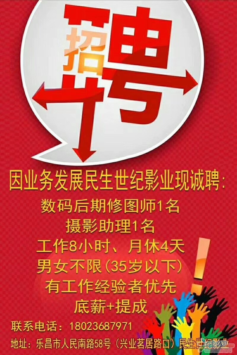 正文摘要:因業(yè)務發(fā)展民生世紀影業(yè)現(xiàn)誠聘: 數(shù)碼后期修圖師1名、攝影助理1名 工作8小時、月休4天 男女不限(35歲以下) 有工作經驗者優(yōu)先 底薪+提成 地址:樂昌市人民南路58號(興業(yè)茗 ... |